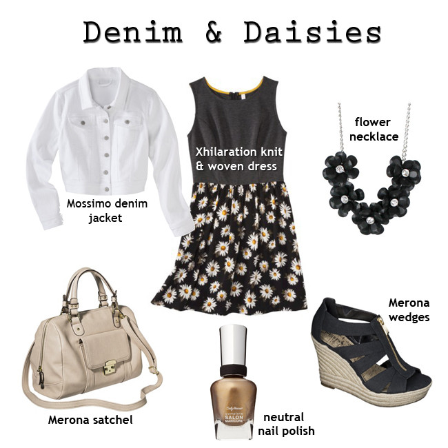 With the resurgence of everything '90s this spring, daisy prints are blooming on a variety of pieces at Target, including this mixed material dress. The woven and knit construction makes it look like separates, and with a fun flower necklace, walkable strappy wedges, and a chic denim jacket, it fits the bill for a sunny spring day. A sleek satchel in a neutral shade of beige ties the look together, while sparkly gold nail polish injects a touch of glamour.